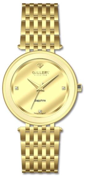 השעון עשוי ממתכת בגימור מבריק, עם רצועת חוליות צפופה בסגנון מלבני. לוח השעון זהוב כולו, עם ארבעה סימוני שעות מינימליסטיים (בשעה 3, 6, 9 ו-12) המסומנים באבני חן קטנות. השעון כולל מחוגי שעות ודקות דקים, ולמעלה מופיע הלוגו של המותג "GALLERY" עם הכיתוב "Sapphire" מתחתיו, מה שמעיד על זכוכית ספיר עמידה בפני שריטות.