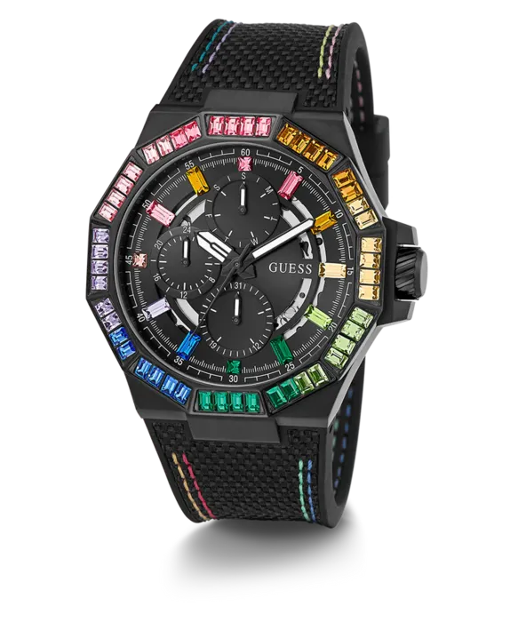 שעון יוקרתי בעיצוב נועז שמשלב סטייל עם אלגנטיות . גוף השעון עשוי נירוסטה בצבע שחור,מסגרת משובצת באבני חן צבעוניות. זכוכית מינרלית וקוטר 45 מ"מ, המעניקים לו מראה מודרני ומתוחכם. רצועת סיליקון שחורה מתופרת צבעוני נוחה ועמידה משלימה את המראה האלגנטי,