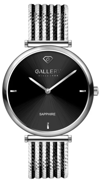השעון עשוי ממתכת בגימור מבריק, עם רצועת חוליות צפופה בסגנון מלבני. לוח השעון זהוב כולו, עם ארבעה סימוני שעות מינימליסטיים (בשעה 3, 6, 9 ו-12) המסומנים באבני חן קטנות. השעון כולל מחוגי שעות ודקות דקים, ולמעלה מופיע הלוגו של המותג "GALLERY" עם הכיתוב "Sapphire" מתחתיו, מה שמעיד על זכוכית ספיר עמידה בפני שריטות.