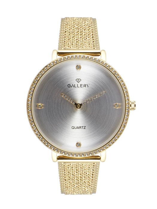 השעון עשוי ממתכת בגימור מבריק, עם רצועת חוליות צפופה בסגנון מלבני. לוח השעון זהוב כולו, עם ארבעה סימוני שעות מינימליסטיים (בשעה 3, 6, 9 ו-12) המסומנים באבני חן קטנות. השעון כולל מחוגי שעות ודקות דקים, ולמעלה מופיע הלוגו של המותג "GALLERY" עם הכיתוב "Sapphire" מתחתיו, מה שמעיד על זכוכית ספיר עמידה בפני שריטות.