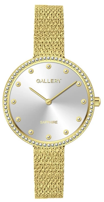 השעון עשוי ממתכת בגימור מבריק, עם רצועת חוליות צפופה בסגנון מלבני. לוח השעון זהוב כולו, עם ארבעה סימוני שעות מינימליסטיים (בשעה 3, 6, 9 ו-12) המסומנים באבני חן קטנות. השעון כולל מחוגי שעות ודקות דקים, ולמעלה מופיע הלוגו של המותג "GALLERY" עם הכיתוב "Sapphire" מתחתיו, מה שמעיד על זכוכית ספיר עמידה בפני שריטות.